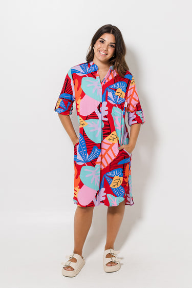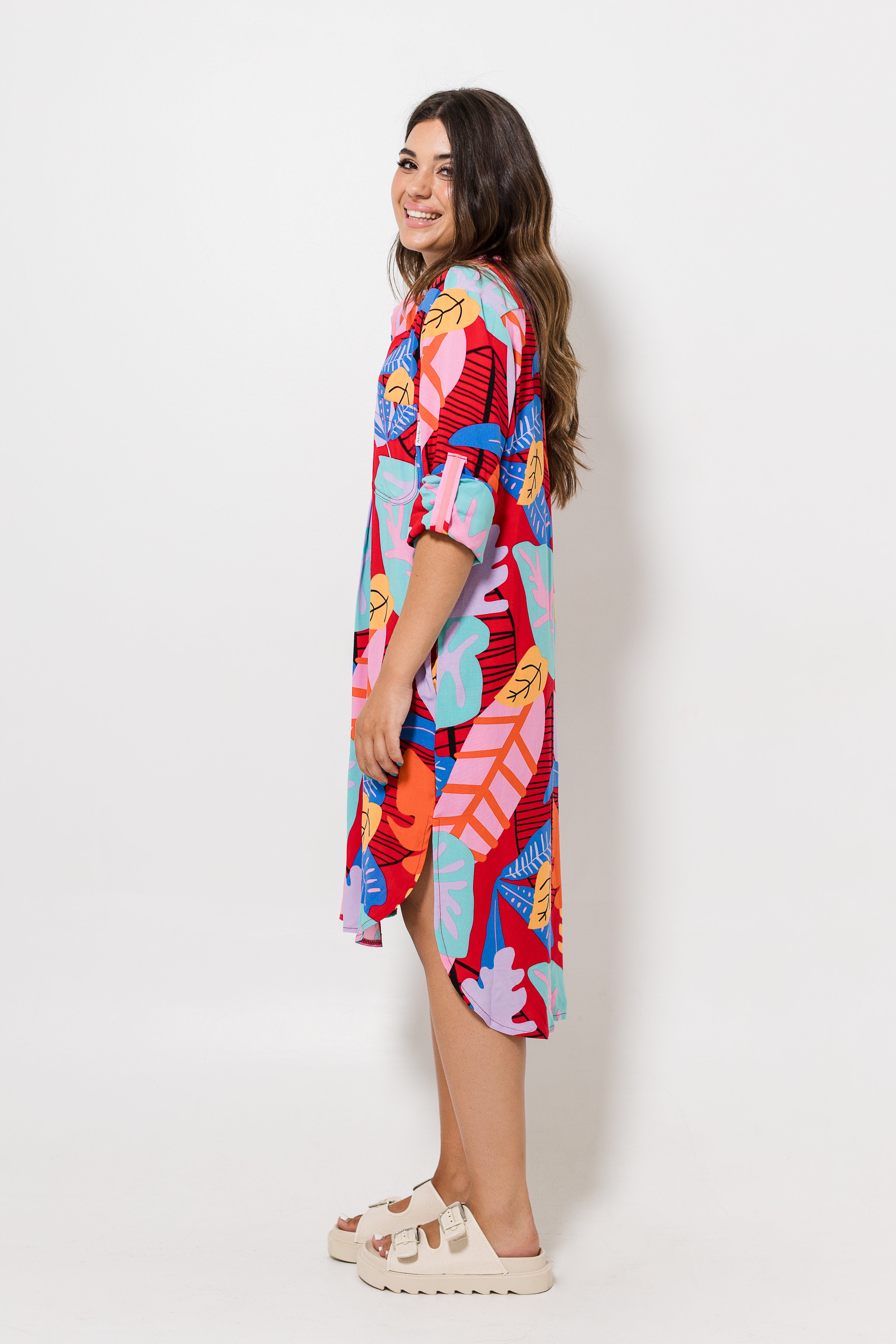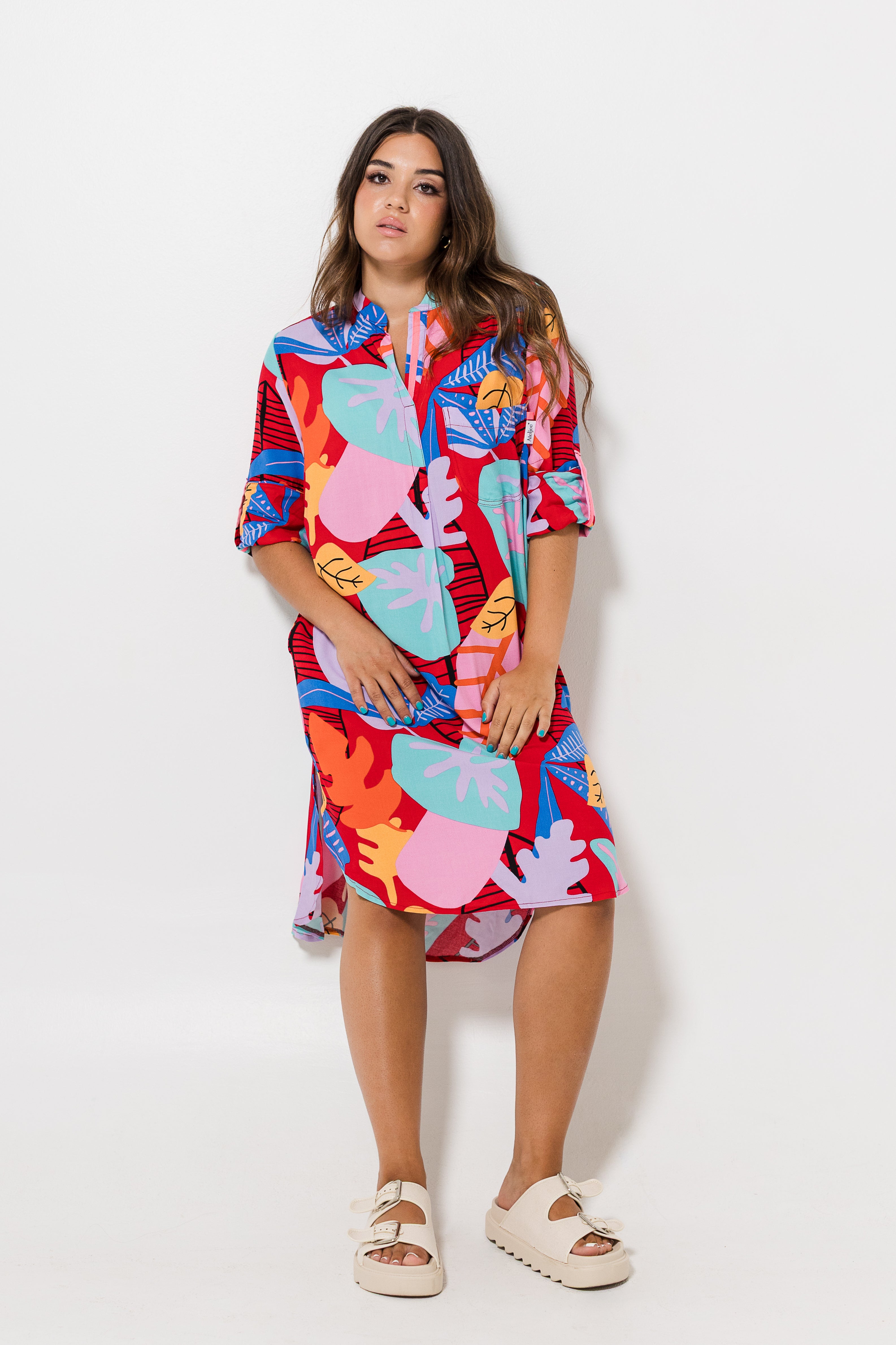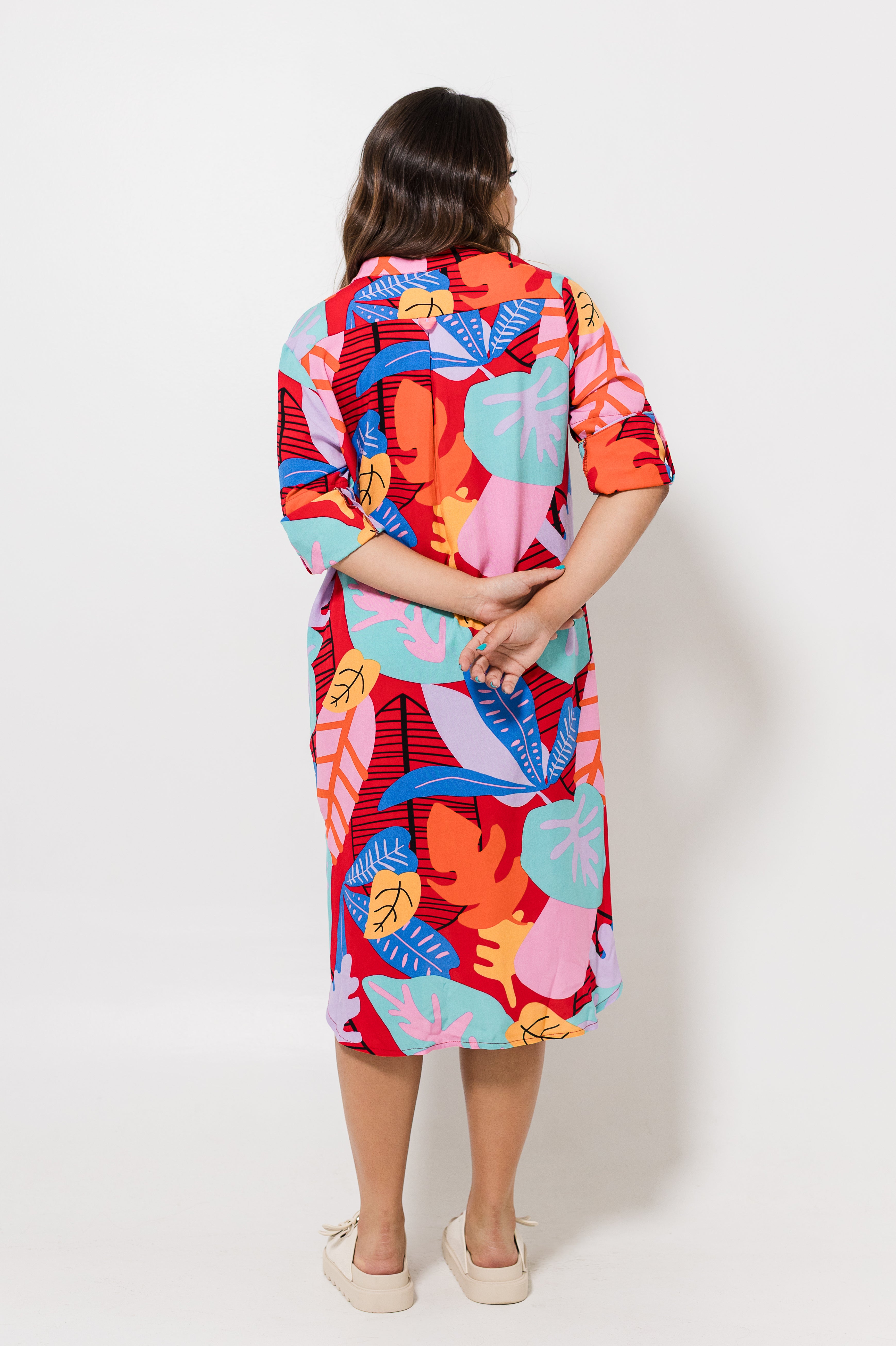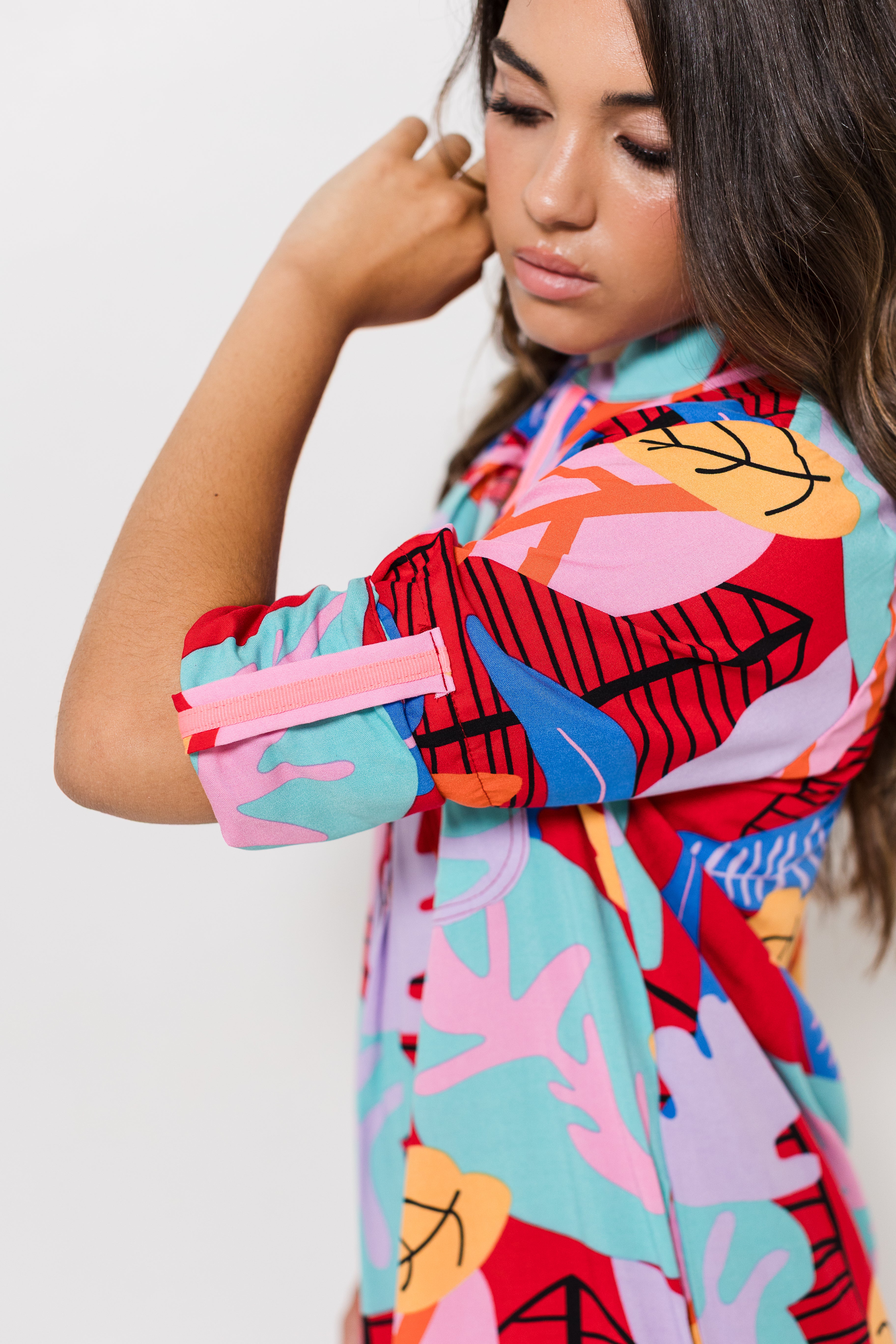 Mandarin Collar dress Turned-up sleeves Side pockets Separate belt tie Neon pink accent trims |