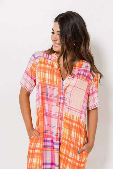 Classic shift-style dress Flattering V-neck detail Turned-up detail on sleeve cuff Side pockets Side slits Back yolk and front pleat detail |