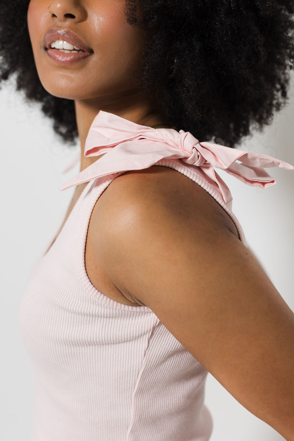 Cotton rib camisole with bow detail trims on shoulders Ribbed texture Scooped neck |