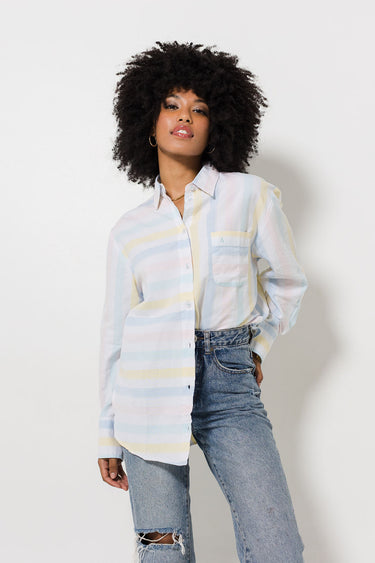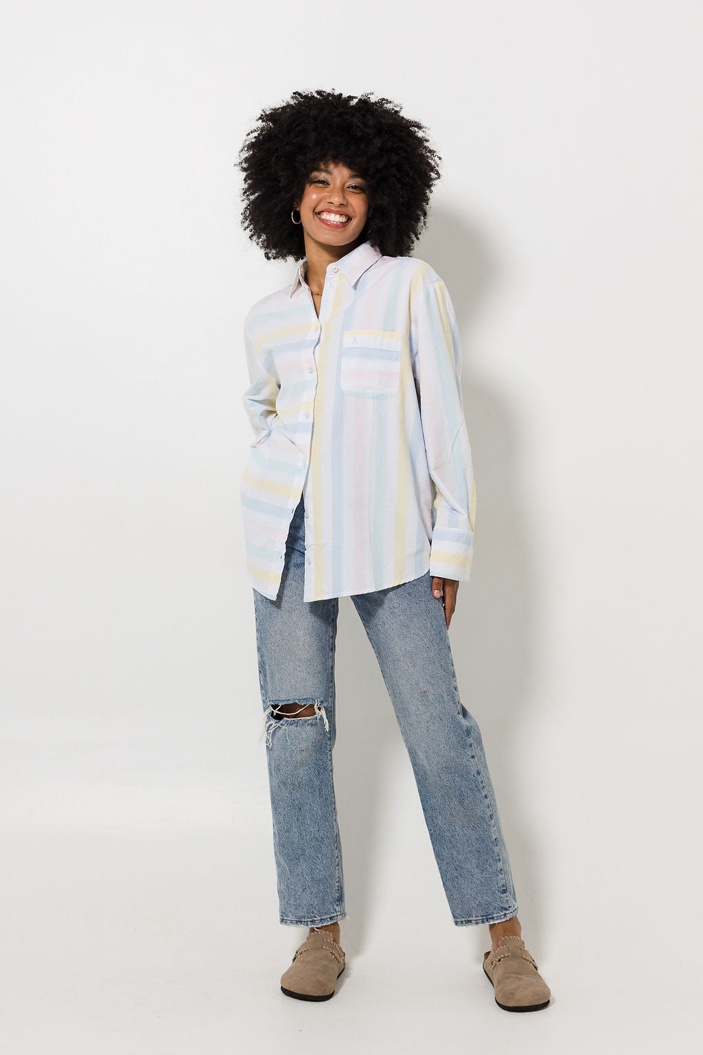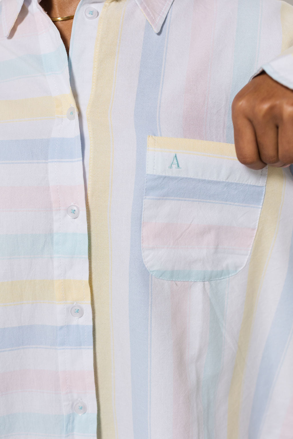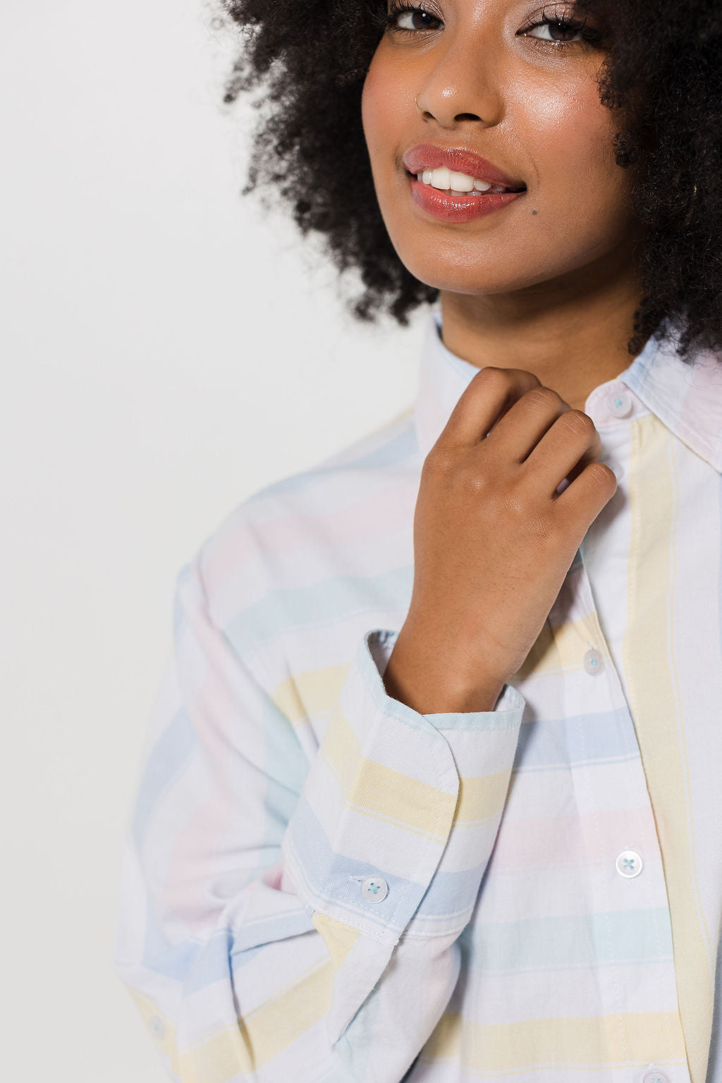 A classic shirt style in a timeless pastel candy stripe Long sleeve with buttoned cuff detail Turn-up tab on sleeve Classic collar Single breast pocket Rounded hem, classic cut A best-selling silhouette |