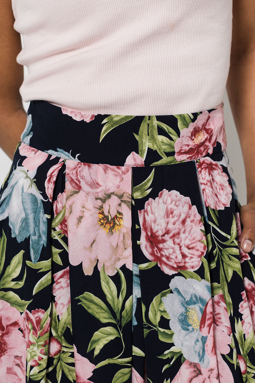 Centre back zip closure Waistband with pleat detail Side pockets |