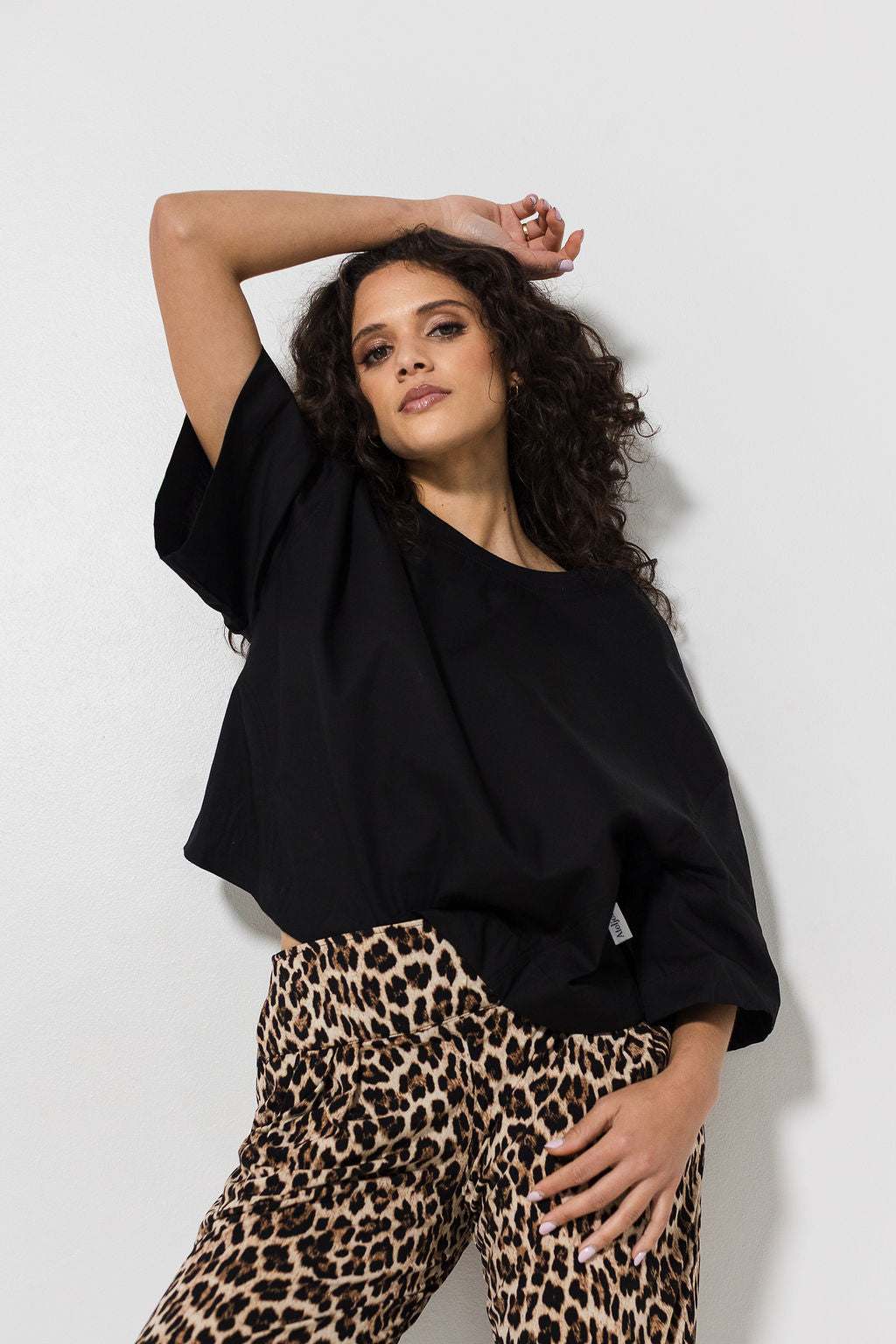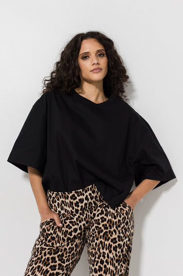 A crew neck boxy tee 100% cotton Poplin Boxy silhouette Boxy sleeves Front cutline detail Back pleats to create shape |