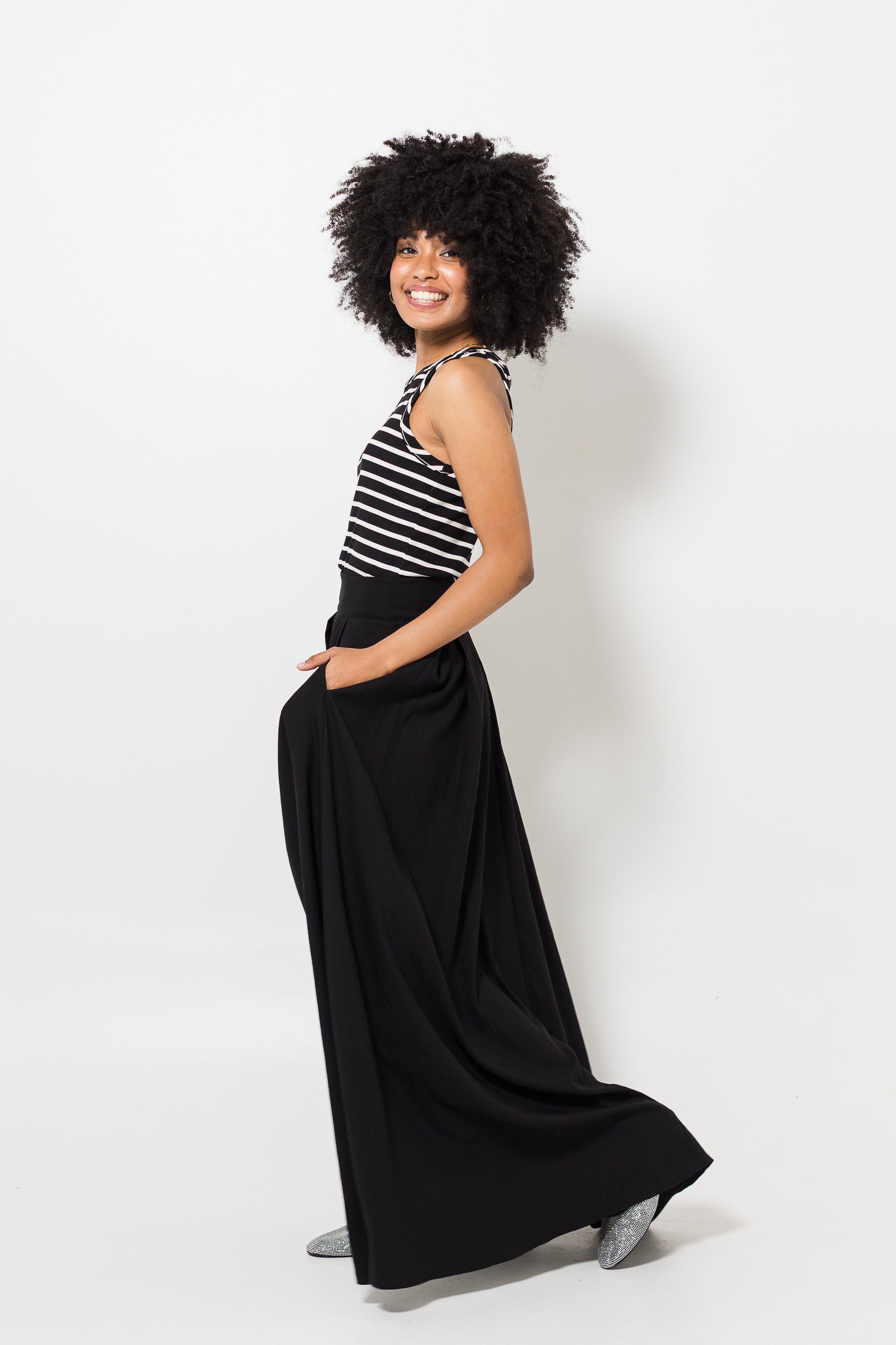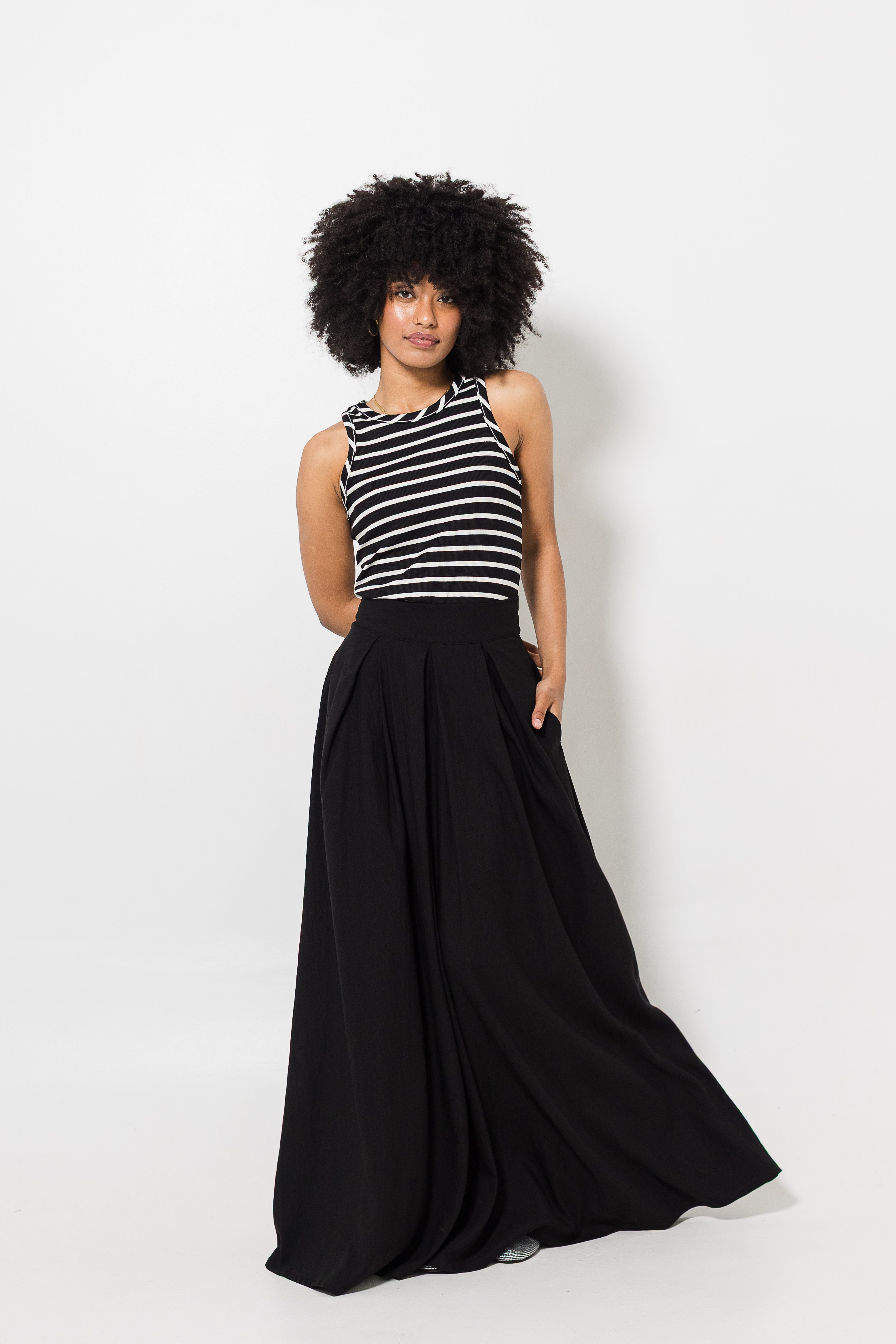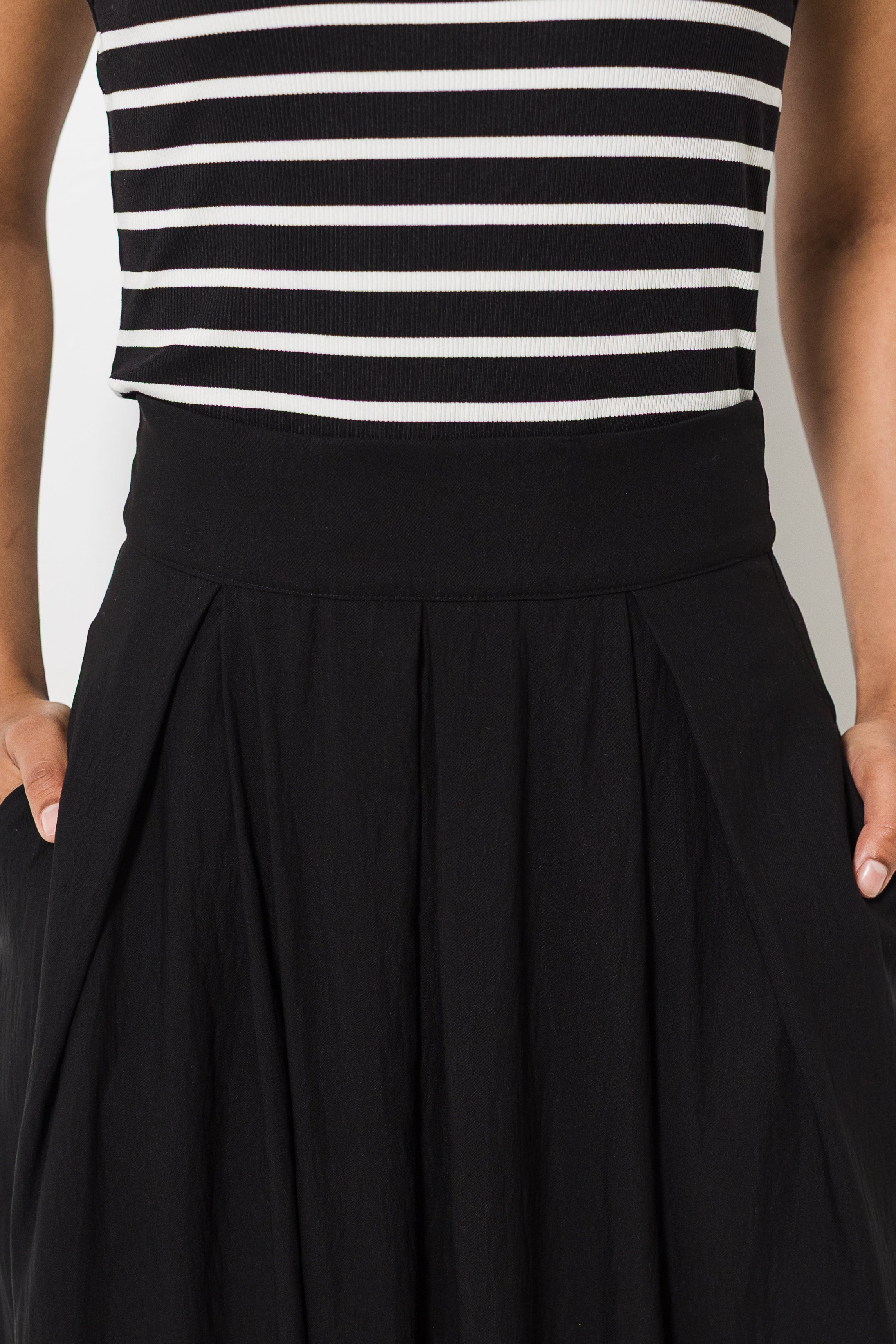 Statement A-line skirt silhouette Centre back zip closure Waistband with pleats Side pockets |