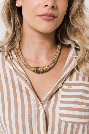 Triangular bib-inspired piece Linea is a study in restraint and elegance - a neckpiece where simplicity becomes sculpture. Soft gold tubular rope forms a flowing base, threaded with tubular beads that catch light subtly, creating a sense of rhythm and movement along the neckline. Every curve and detail celebrates form, proportion, and quiet sophistication, making it a piece that feels both modern and timeless. Minimalist yet striking, Linea is designed to be worn, admired, and treasured as a singular work of art. Dimensions: total length 45cm with a 6cm extender chain |