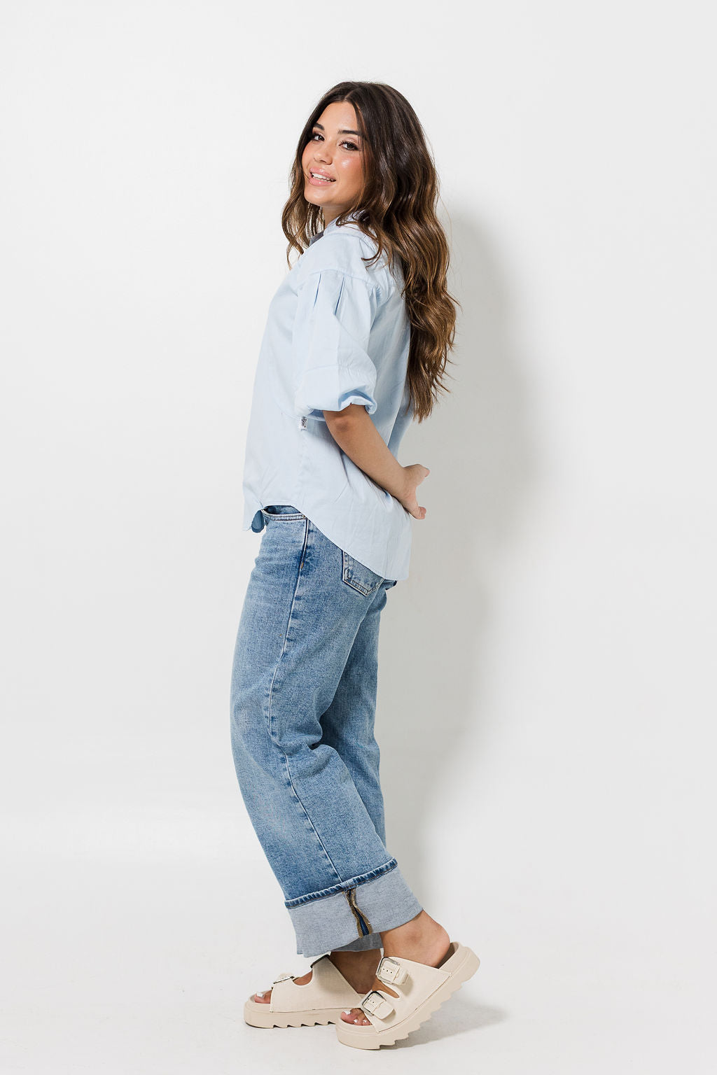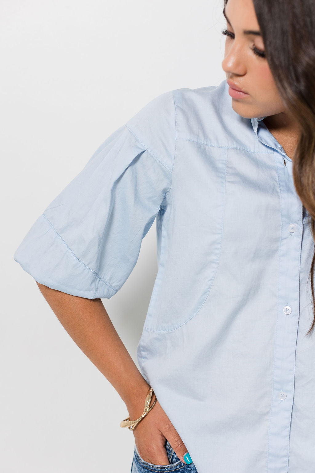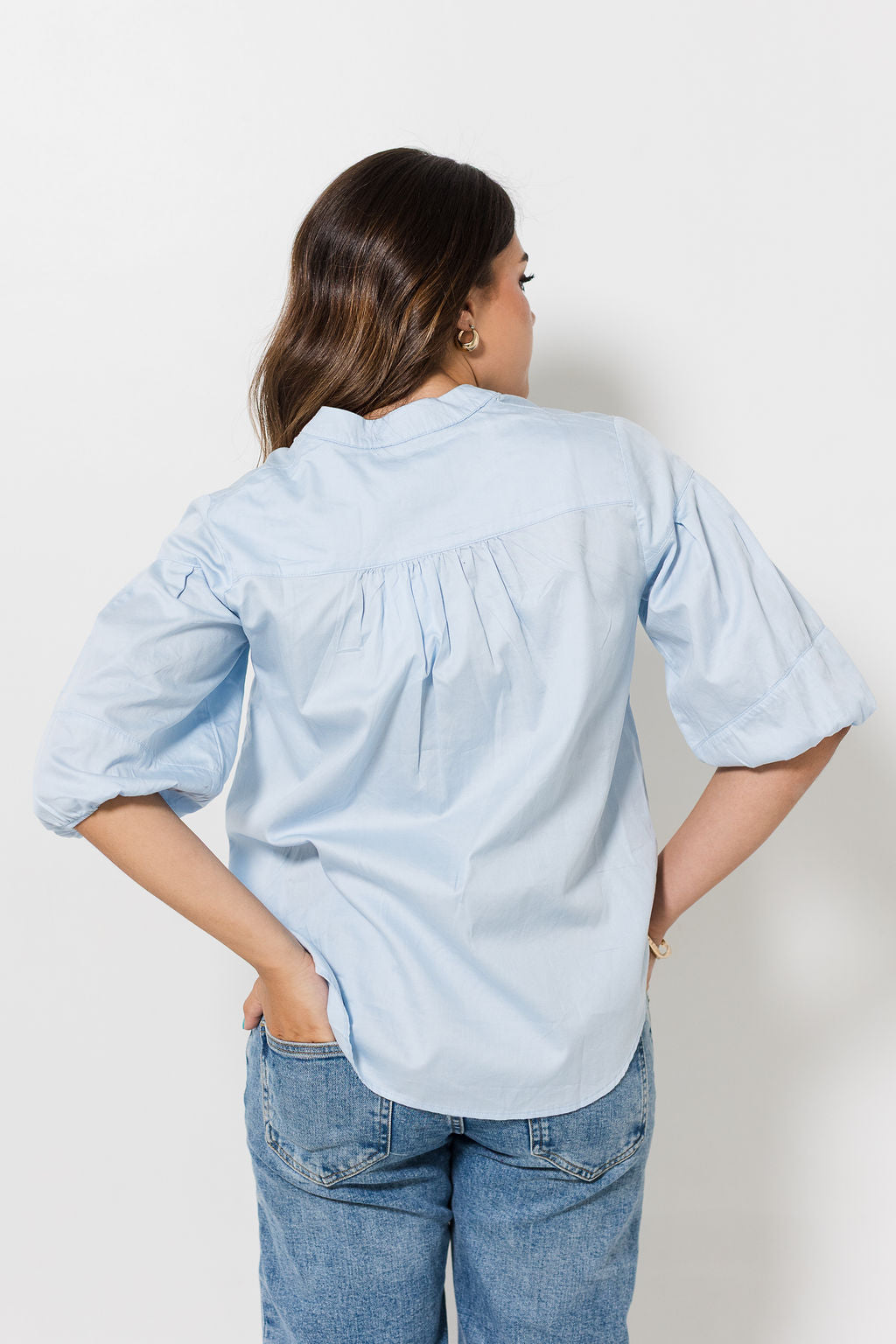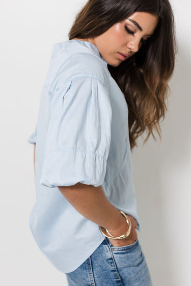 Soft Cotton sateen flow shirt Directional puff sleeve detail Signature mandarin collar Centre front functional button closure A timeless capsule wardrobe item |